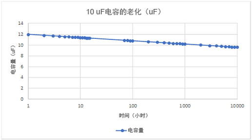簡(jiǎn)單來(lái)說(shuō),就是經(jīng)過(guò)一次熱循環(huán)后,這個(gè)電容每十倍時(shí)大約會(huì)損失5%的電容值。比如在回流制程后一個(gè)小時(shí),它的讀數(shù)約為12uF。十個(gè)小時(shí)后,它的電容會(huì)下降5%。一百個(gè)小時(shí)后,它又會(huì)下降5%。一千個(gè)小時(shí)后,它又會(huì)再下降5%,這符合他們預(yù)期的設(shè)計(jì)公差。