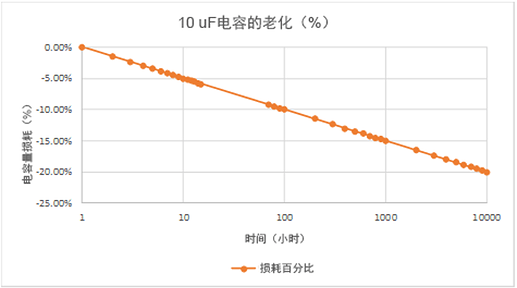 舉個(gè)例子,KEMET有一種編號(hào)為C1210C106K4RACTU的零件,這是一種具有X7R溫度系數(shù)的10uF的零件。KEMET說(shuō),這個(gè)零件在經(jīng)過(guò)回流焊接后的一段時(shí)間內(nèi),會(huì)有一個(gè)設(shè)計(jì)公差范圍內(nèi)的損失。他們用“十倍時(shí)”來(lái)衡量這個(gè)過(guò)程。這個(gè)“十倍時(shí)”的概念,是指比上一次測(cè)量長(zhǎng)十倍的時(shí)間,也就是時(shí)間的對(duì)數(shù)尺度,不是線性尺度。